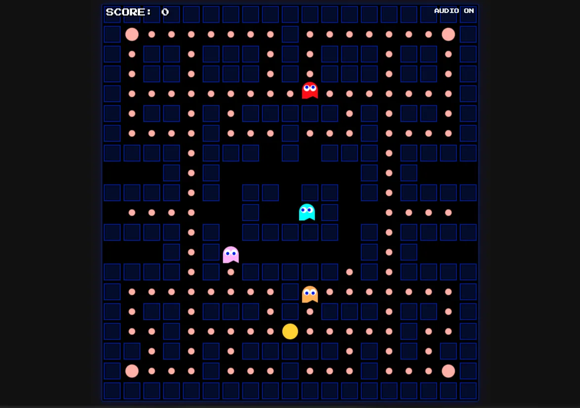GameA retro Pac-Man game featuring responsive design, touch controls, procedural graphics, synthesised audio effects, and classic ghost mechanics.